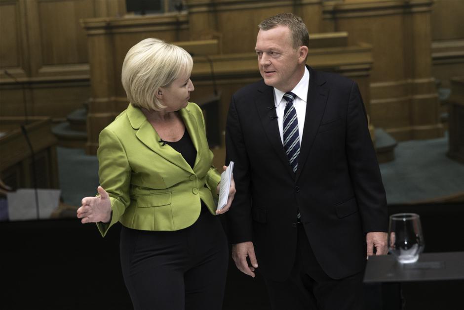 Her står Lars Løkke Rasmussen og taler med Tine Gøtzsche, der var vært på aftenens tv-duel. (Foto: © Bjarne Bergius Hermansen)