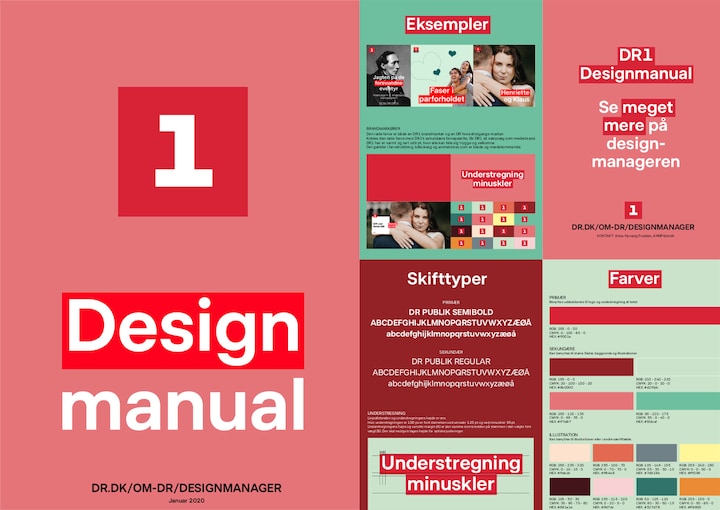 Den røde farve er både en DR1 brandmarkør og en DR hovedindgangs-markør. Kobles den røde farve med DR1’s sekundære farvepalette, får DR1 sit særpræg som mediebrand.