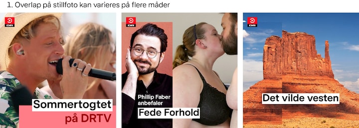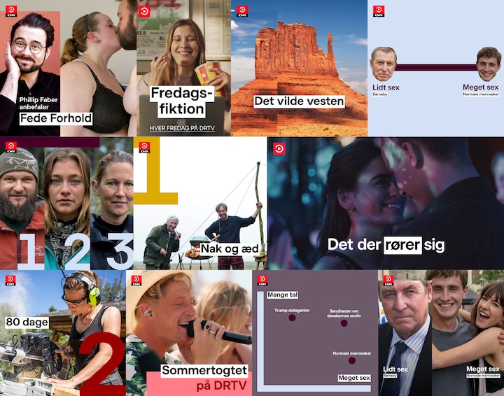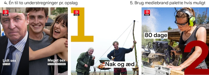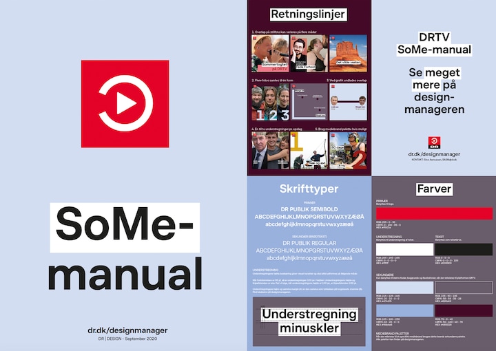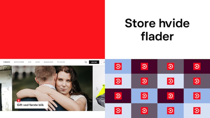 DRTV’s vigtigste brandmarkører er de store hvide flader, DR Publik Semibold i minuskler og den røde farve som accent. Så selvom den røde er den primære logofarve, så bruges den aldrig til understregninger. Understregningerne vil altid være hvide med sort tekst.