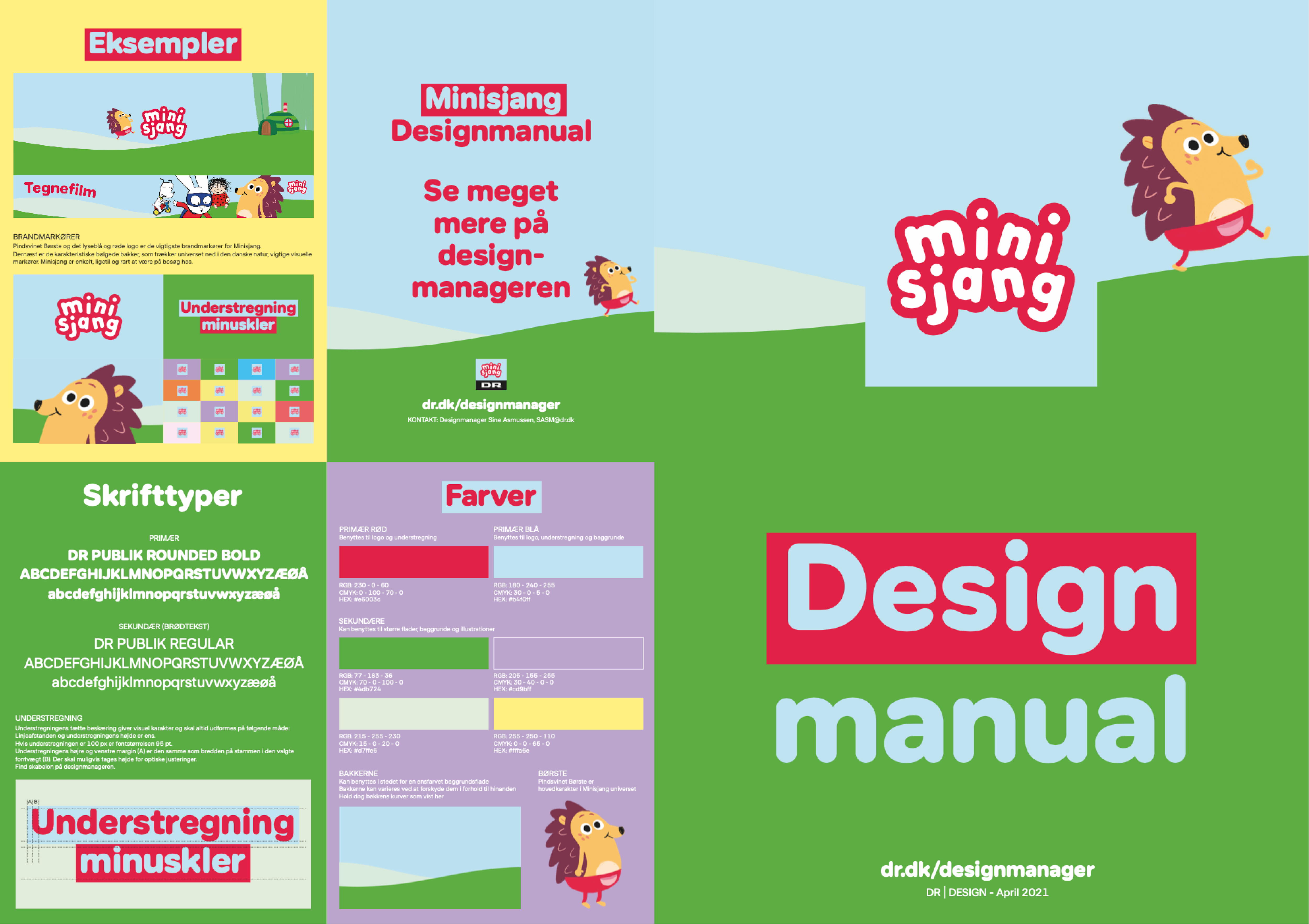 Pindsvinet Børste og det lyseblå og røde logo er de vigtigste brandmarkører for Minisjang. Dernæst er de karakteristiske bølgede bakker, som trækker universet ned i den danske natur, vigtige visuelle markører. Minisjang er enkelt, ligetil og rart at være på besøg hos.