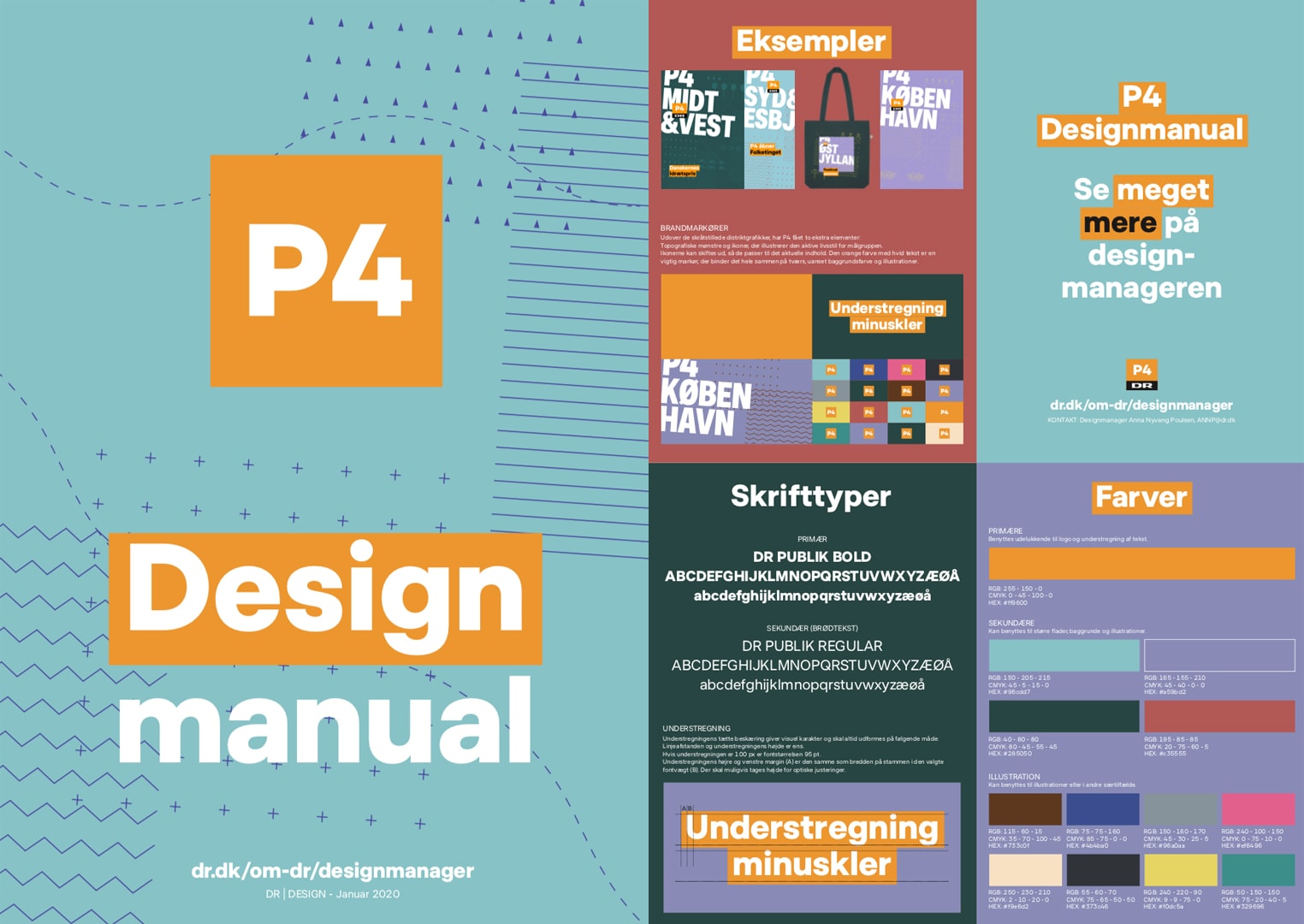 Den orange farve med hvid tekst er en vigtig markør, der binder det hele sammen på tværs, uanset baggrundsfarve og illustrationer.