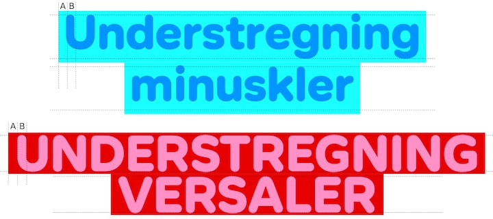 Understregningens højre og venstre margin (A) er den samme som tykkelsen på bogstavets stamme (B).