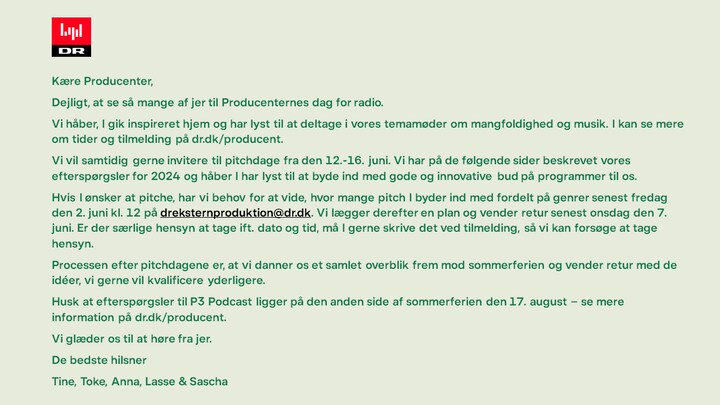 Vi vil gerne invitere til Pitchdage for radio den 12. - 16. juni 2023. Nedenfor findes deadline og proces.