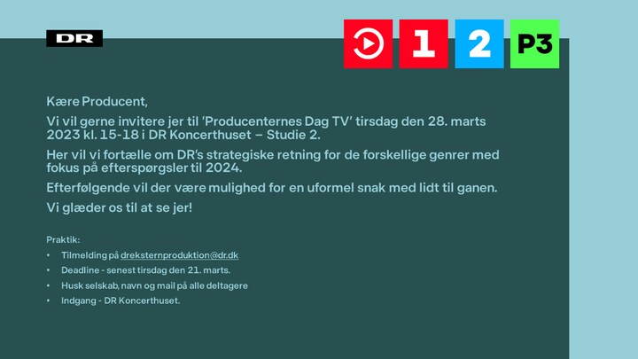 Vi vil gerne invitere jer til ’Producenternes Dag TV’ tirsdag den 28. marts 2023 kl. 15-18 i DR Koncerthuset – Studie 2.