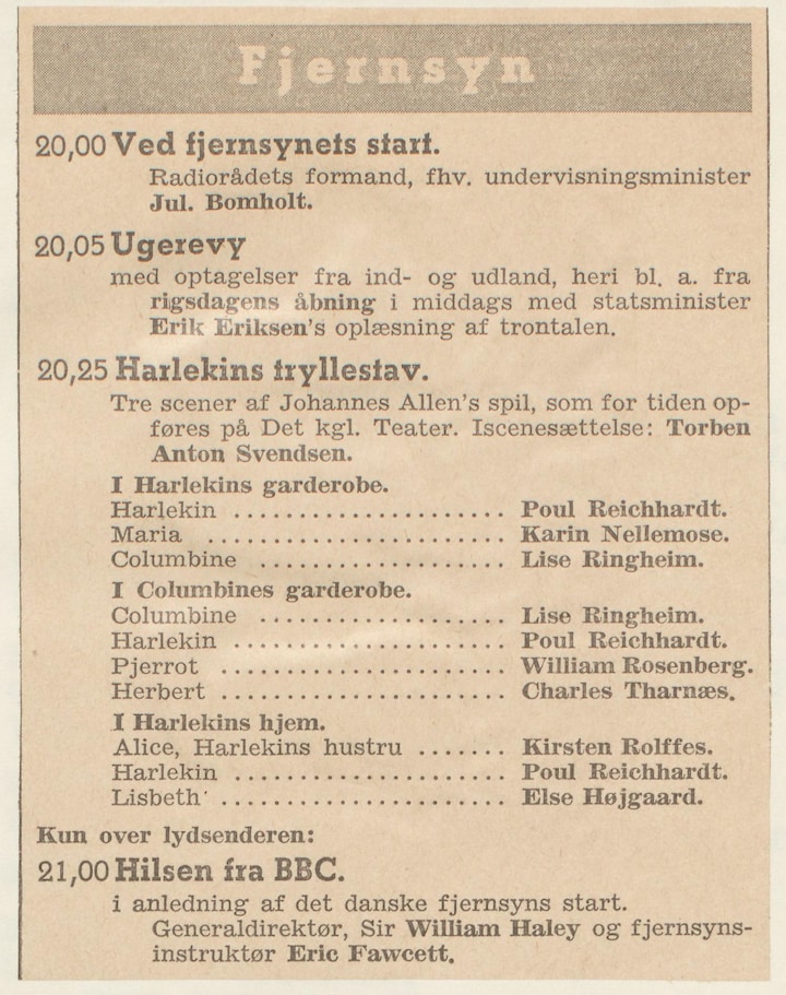 Rigsdagen – nu Folketinget – var blevet åbnet samme formiddag, så de 200 seere kunne se optagelser derfra, ligesom DR stadig sender fra Folketingets åbning. Og så var der tre scener fra Det Kongelige Teaters Harlekins tryllestav. Alt var sort-hvid-optagelser.