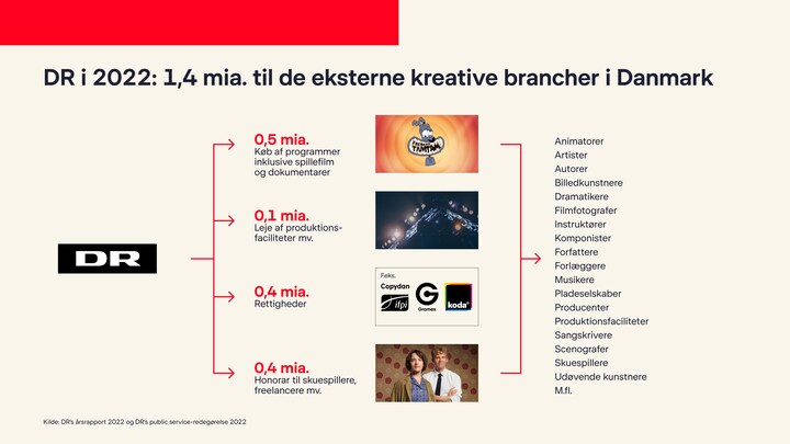 1,4 milliarder kroner lagde DR i 2022 i de eksterne kreative brancher i Danmark. Der er tale om midler til mange forskellige aktører. Alt - lige fra musikere og skuespillere, der modtager betaling for rettigheder, støtte til danske film og dokumentarer og midler til eksterne produktioner. For eksempel den prisvindende podcast ‘Spiralkampagnen’, den historiske dramadokumentar ’Krag & Virkner’ og den helt nye danske animationsserie ’Karlas Fantalastiske Klasse’, som er en del af det nye 'FredagsTamTam'.