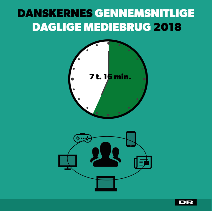 Hver dag bruger hver dansker næsten lige så meget tid på medier som på at arbejde – i hvert fald hvis man er en af dem, der har en 37 timers arbejdsuge. Helt præcist brugte hver dansker over tre år dagligt syv timer og 16 minutter på medier i 2018.