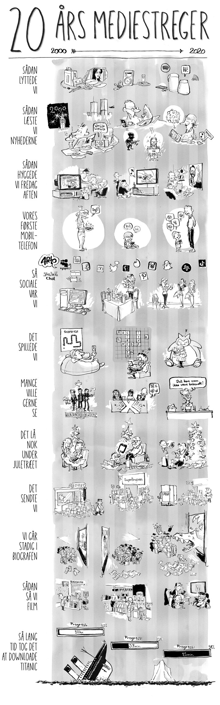 For blot 20 år siden var internettet et relativt nyt fænomen. Dengang tog det væsentligt flere timer at downloade filmen Titanic, end det i 1912 tog luksusdamperen at støde på et isbjerg, knække midt over og synke i havet. I dag tager det få minutter at hente Leonardo DiCaprio ned på telefonen. Ny teknologi, nye medier og nyt indhold ændrer lidt efter lidt vores adfærd og er fra tid til anden med til at ændre måden, vi lever vores liv på. Nogle medievaner revolutionerer vores liv fra dag et. Vi har zoomet lidt ud og bedt tegneren Jon Skræntskov om at skitsere vores mediebrug gennem dette årtis foreløbige dekader.