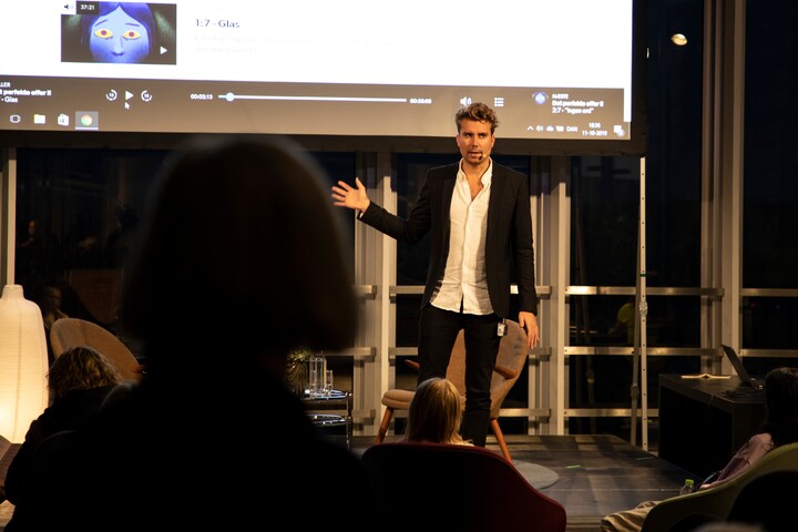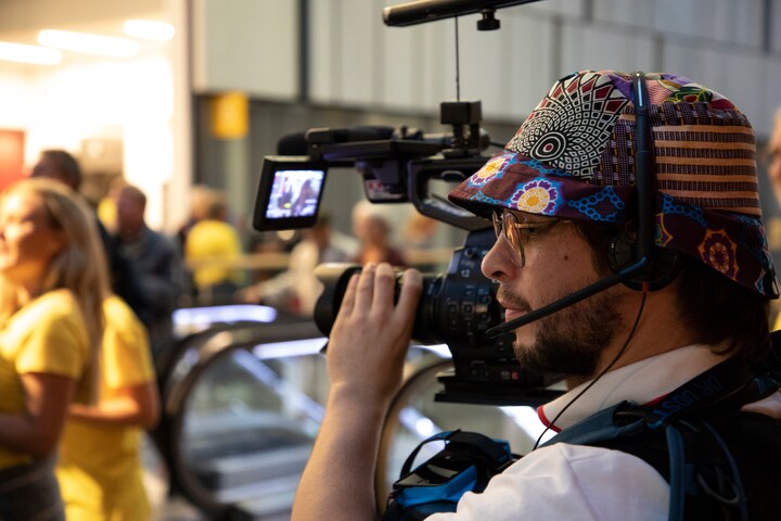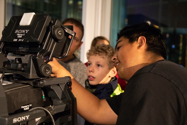 Hele aftenen bevægede to fotografer sig rundt mellem de besøgende og filmede, mens en klipper sørgede for, at billederne blev sat sammen til en flot liveudsendelse. Liveudsendelsen blev vist på skærme rundt omkring i DR Byen. Her FTP-elev Philip Nussbaum Varlev. (Foto: Magnus Eg Møller)3 / 18