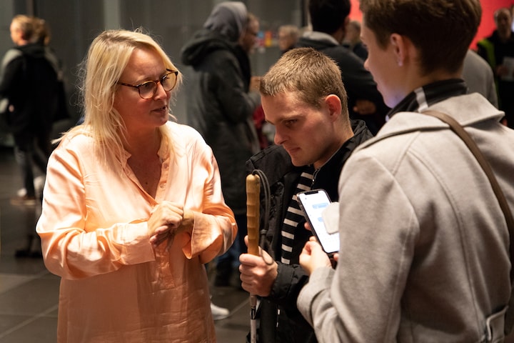 Speaker Stine Schwennesen har lige gennemført en live synstolkning. Her møder hun en af dem, der benytter sig af tilgængelighedstilbuddet. (Foto: Magnus Eg Møller)12 / 18