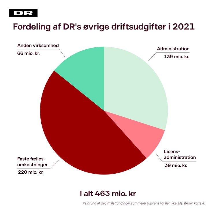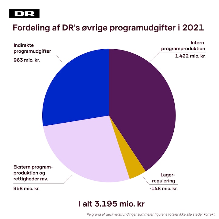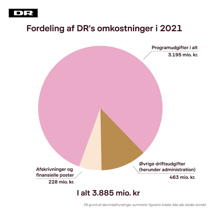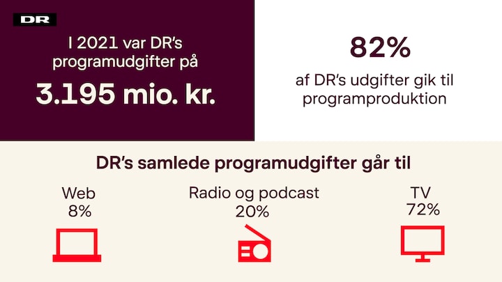 I 2021 var DR’s samlede udgifter 3.885 mio. kr. Programproduktionen udgjorde 3.195 mio. kr. og dermed gik 82 procent af de samlede udgifter til programmer. Øvrige driftsudgifter til blandt andet administration, faste fællesomkostninger og licensinddrivelse samt afskrivninger og finansielle poster udgjorde tilsammen 18 procent af udgifterne.