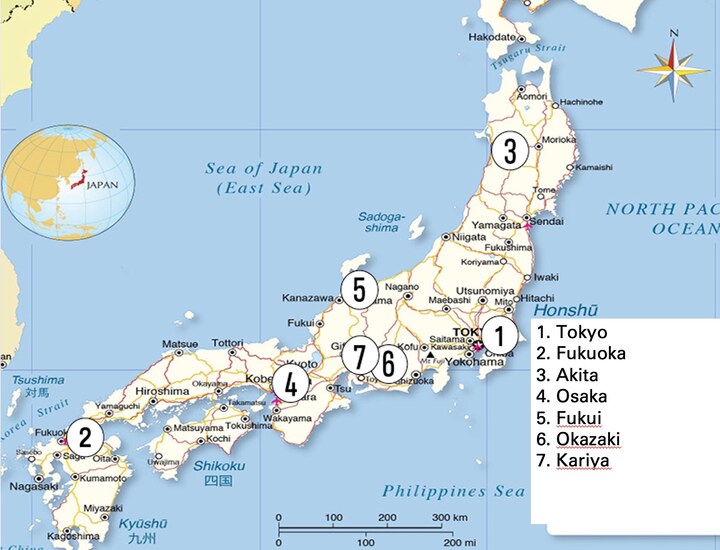 DR Big Bands turné strakte sig over store dele af Japan, og transporten mellem koncertstederne foregik med både fly, bus og tog. På kortet her kan man se de syv byer, bandet besøgte på turnéen: Tokyo, Fukuoka, Akita, Osaka, Fukui, Aichi/Okazaki og Kariya.3 / 8