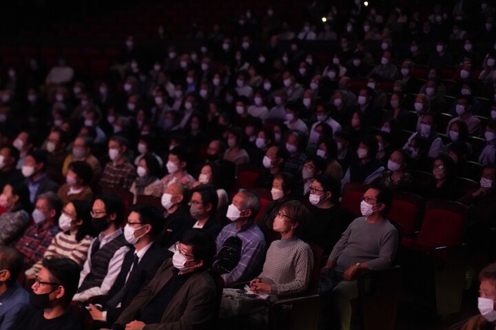 I Japan er der først for nylig lempet på en del covid-19-restriktioner. Men publikum skal sidde med mundbind på under koncerterne, der må ikke råbes eller piftes, og der må ikke gives stående bifald. Til gengæld fik DR Big Band kraftigt siddende bifald under hele turneen, og nogle i publikum havde endda medbragt bannere for at udtrykke deres begejstring. Foto: DR Big Band.5 / 8
