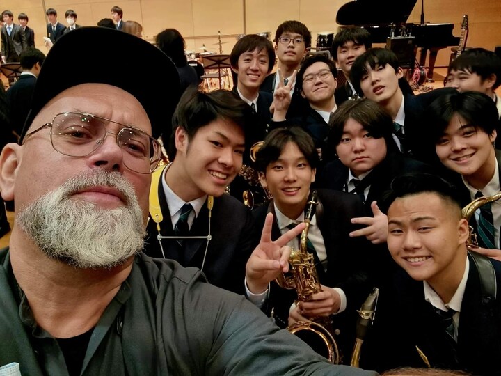 DR Big Band fik også tid til at lave en workshop med unge studerende på drengeskolen Rikkyo Ikebukuru High School, til stor begejstring både for studerende, skolens lærere, DR Big Band og de unges forældre. På billedet er det DR Big Bands Karl-Martin Almqvist, der poserer sammen med de japanske musikstuderende. Foto: DR Big Band.8 / 8