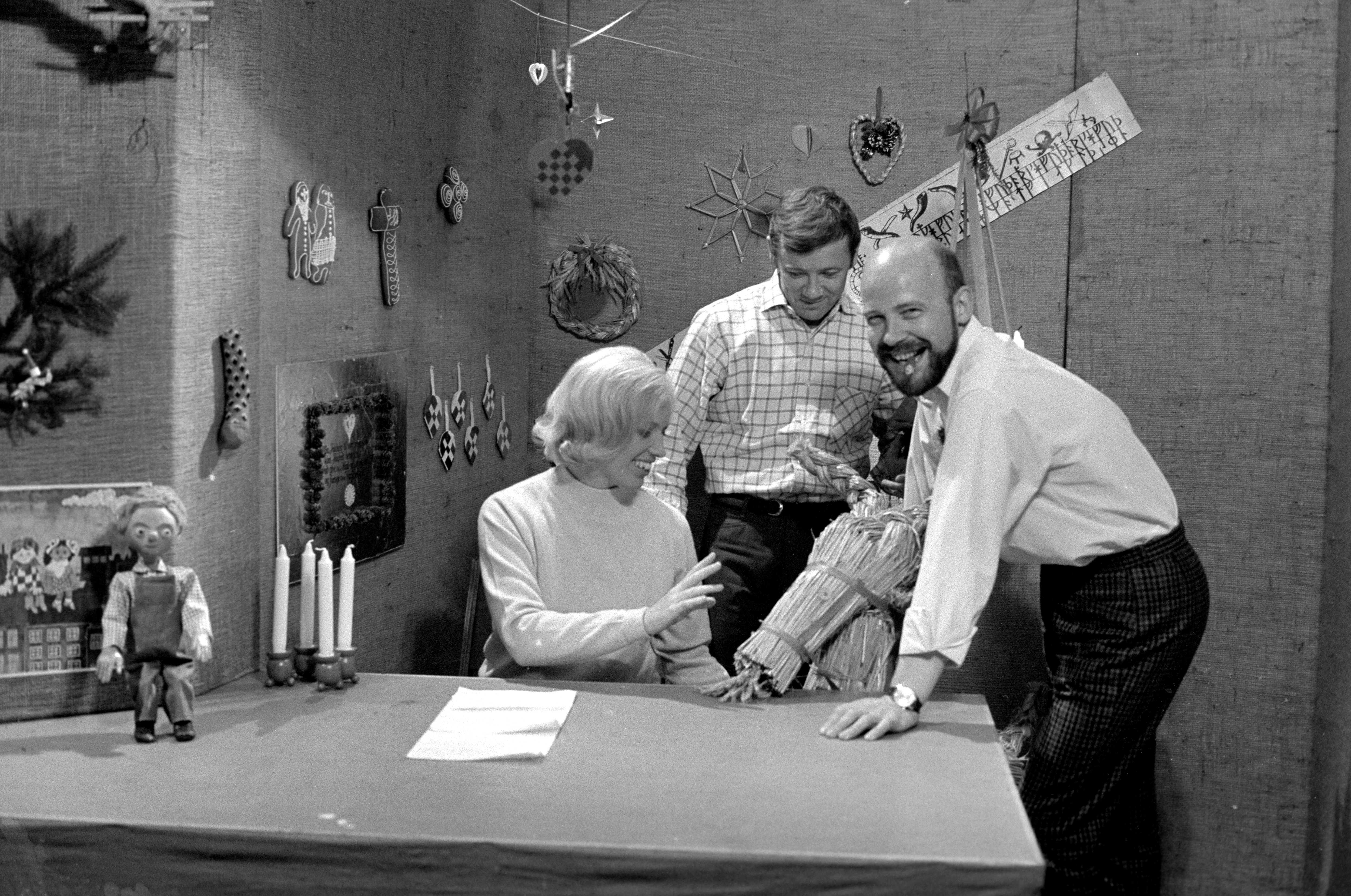 Lillebror er lidt ude på venstre fløj, mens 'de voksne' Ingrid Skovgaard, Bob Goldenbaum og Thorkild Demuth skæmtes i studiet. Demuth er skuespiller, dukkemager og instruktør, mens Goldenbaum, der lagde stemme til Lillebror, er skuespiller, komponist og viseforfatter. (Foto: © Dr arkiv)