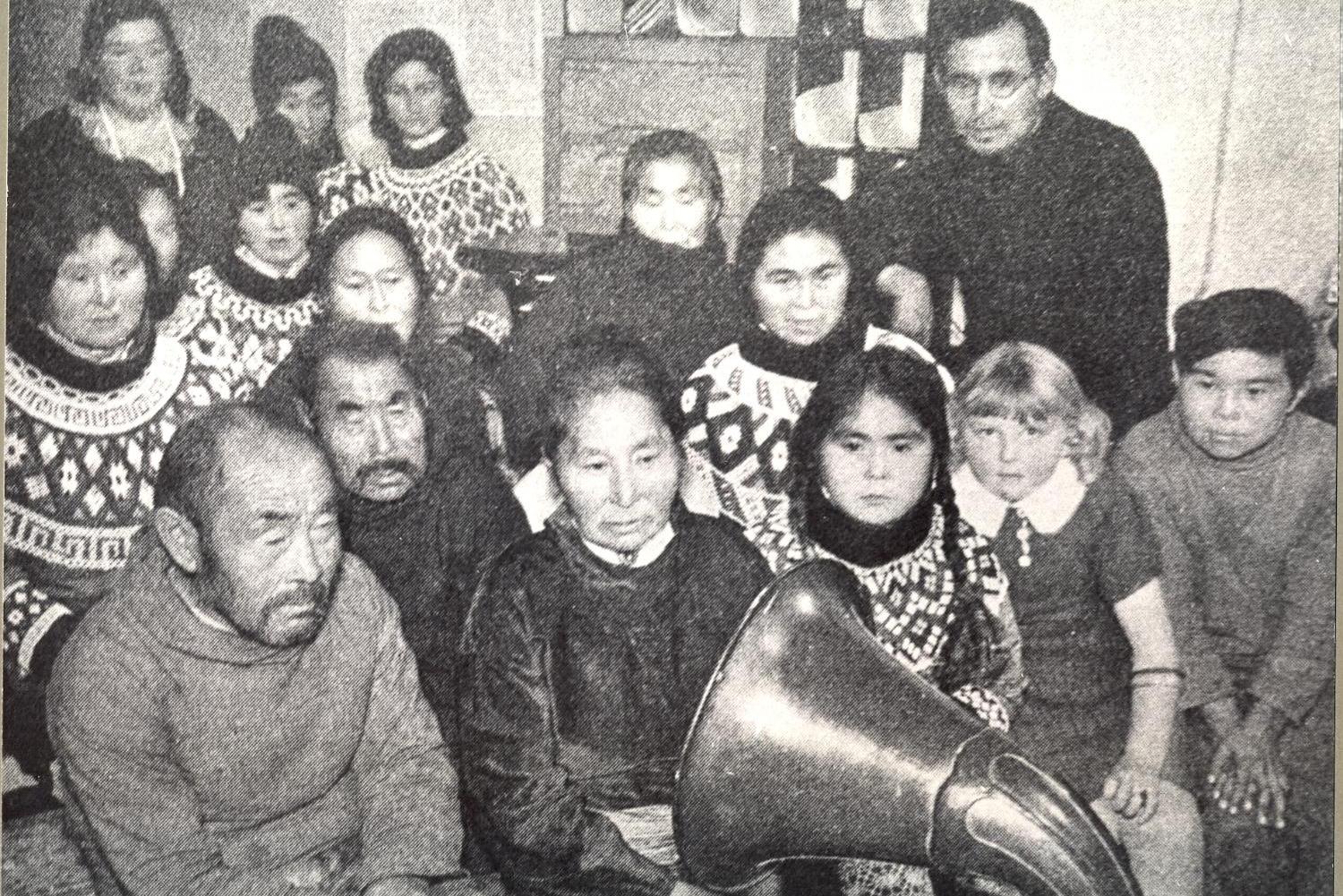 Da det var i 1932, julehilsnerne startede i DR-regi, er det i år 85. gang, de bliver sendt, og her er en grønlandsk familie i gang med lytningen. De første mange år blev programmet sendt i radioen, men siden 1985 har ’Julehilsen til Grønland’ været et tv-show. (Foto: © DR Arkiv, Type 1)