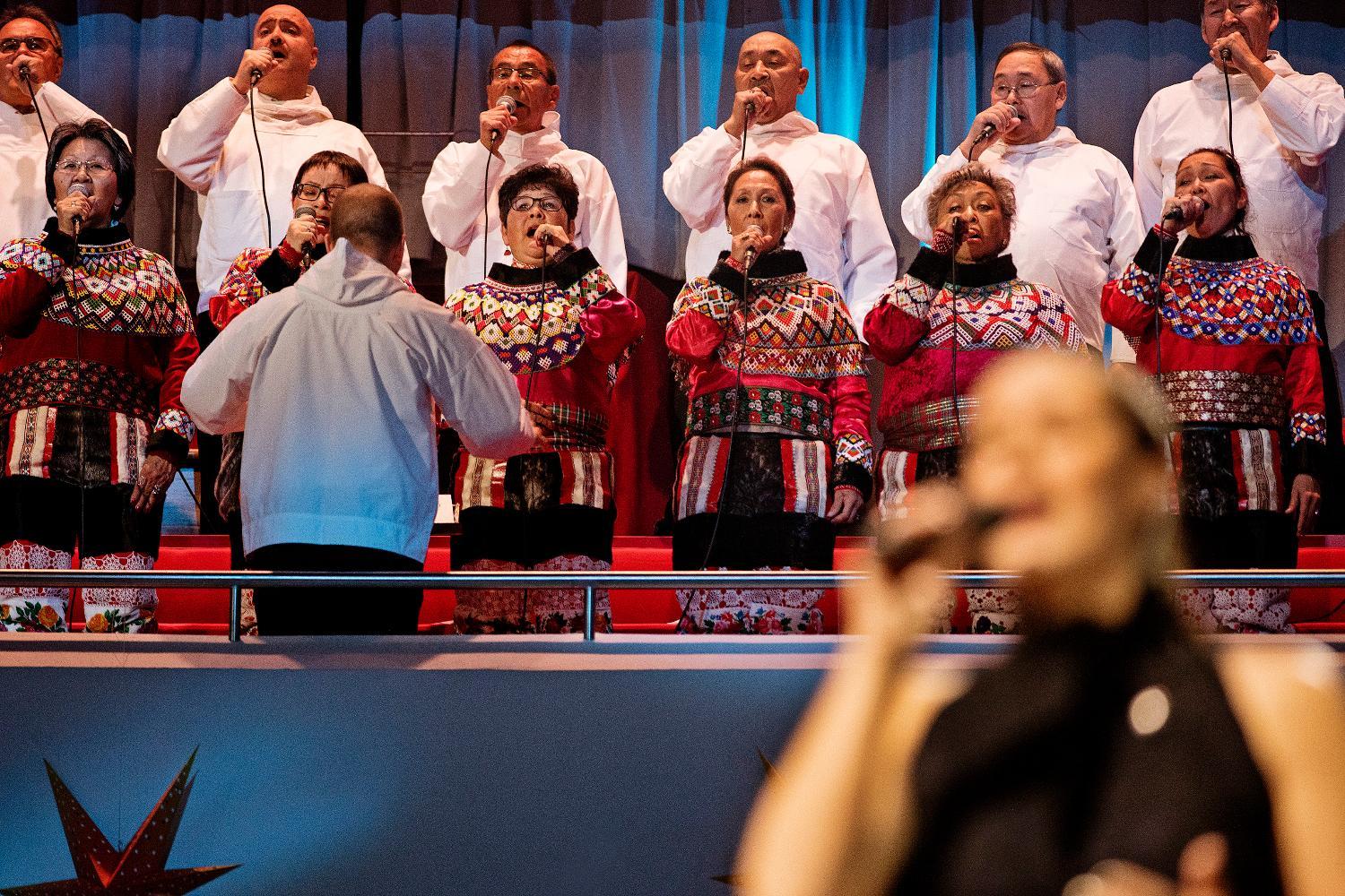 Aalborg er den by i Danmark, hvor der bor flest grønlændere i forhold til det samlede indbyggertal, og byen har både et grønlænderkvarter, en grønlænderhavn, et grønlandsk kor samt Hans Egedes Kirke, der holder grønlandske gudstjenester. Det grønlandske kor Ikinngutigiit var på scenen ved lørdagens show. (Foto: © Agnete Schlichtkrull, Type 1)