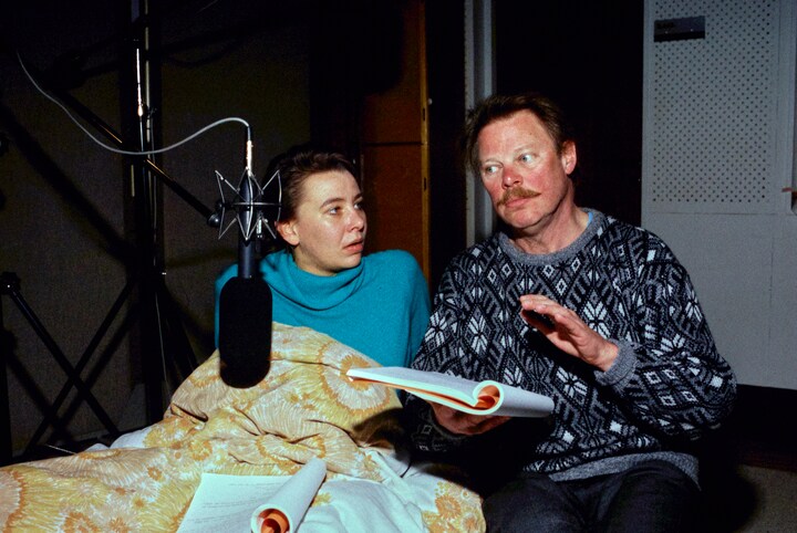 Det er ikke blot i DR's dramaserier og TV-film, Kirsten Olesen har medvirket gennem årene. Hun har også gjort det i Radioteatret - noget, som ofte er blevet lavet om formiddagen, når der ikke skulle arbejdes på teatrene. Her er Kirsten Olesen ved at lave radiodrama sammen med Frits Helmuth. Hvad stykket hed, fremgår desværre ikke af billedet. (Foto: © DR / Rolf Konow)10 / 13