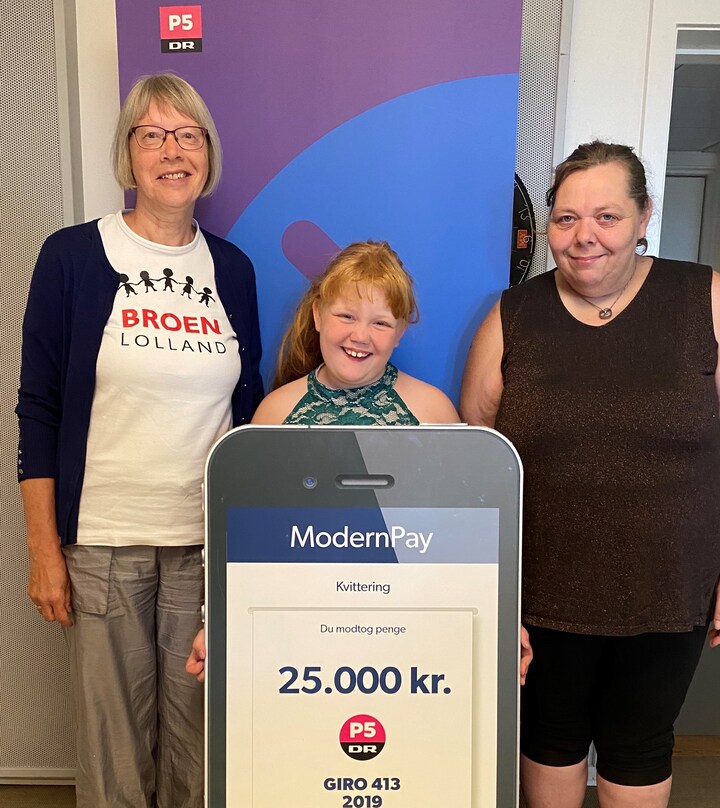 De næsten 186.000 kroner, som lytterne sidste år samlede ind til radioens populære ønskeprogram, 'Giro 413', har skiftet hænder i løbet af de seneste uger. P5-vært Peter Sten, der ses på billedet lige under dette foto, har personligt været ude at overrække kronerne til en række projekter og oplevelser for udsatte og socialt dårligt stillede børn og unge. 'Giro 413' sendes hver uge fra DR i Næstved, og her var formand for Broen Lolland, Bente Kruuse, samt Laila og datteren Cecilie i studiet for at få overrakt 25.000 af sidste års kroner. Cecilie er begyndt at gå til spejder, men med en mor på kontanthjælp var der ikke også lige råd til spejderskjorte, sommerlejr med mere. Takket være kronerne fra 'Giro 413' har 30 børn fra Broen Lolland fået mulighed for at deltage i fritidsaktiviteter på lige fod med deres jævnaldrende. Ifølge Cecilies mor har det givet en gladere pige og et godt sammenhold i gruppen. Giro 413-uddeling 2020 - Broen Lolland, Bente Kruuse, mor Laila og Cecilie (Foto: © (DR))1 / 9