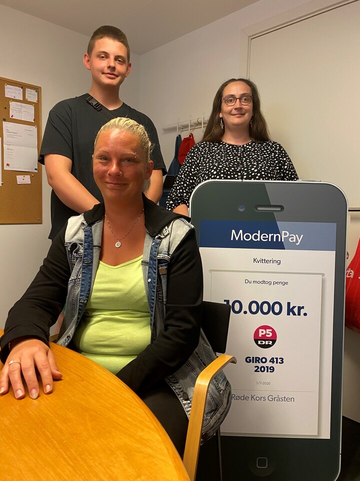 Lukas, Jane og Lene modtog pengene, da Peter Sten besøgte Røde Kors Gråstens Familienetværk. Her skal de 10.000 kroner gå til en udflugt til Legoland for familienetværket. der består af 30-35 familier med både store og små børn. Familienetværket er for familier, der er i en stram økonomisk situation - det kan være, fordi forældrene er sygemeldt eller har været ude for en ulykke. (Foto: © (DR))5 / 9