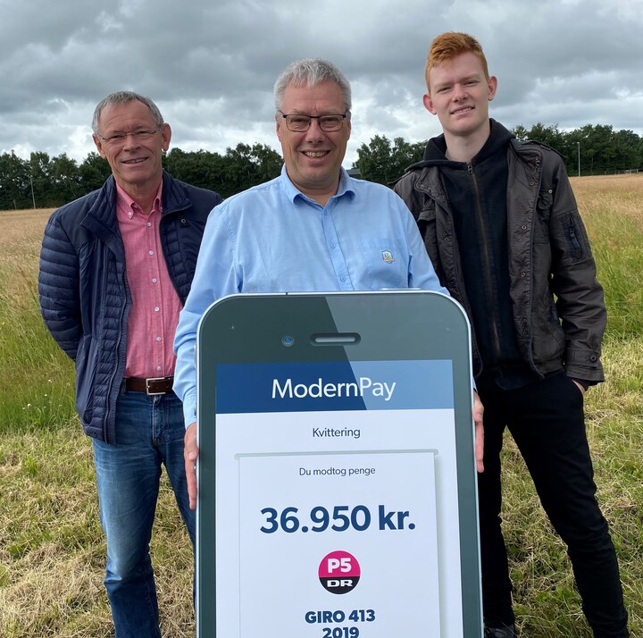 Årets største beløb fra 'Giro 413' - nemlig 36.950 kroner - overrakte vært Peter Sten til Tom T. Pedersen, Karl Erik Laursen og Benjamin fra Talentspejderne i Hedensted. Landsforeningen Talentspejderne har gennem de seneste 10 år hjulpet tæt på 1000 unge mellem 12-15 år med at finde ud af, hvad der er netop deres styrker, evner og talenter. Pengene fra 'Giro 413' skal gå til et talentprogram med fokus på valg af uddannelse for socialt udsatte unge i Storkøbenhavn. (Foto: © (DR))8 / 9