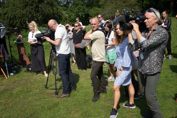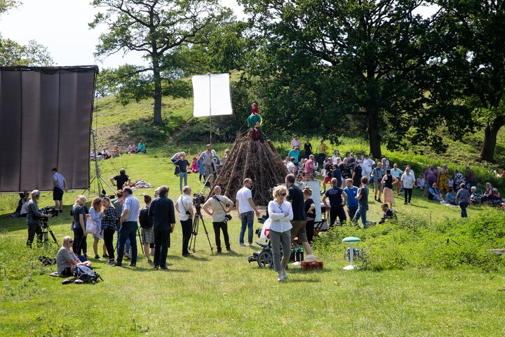 Pressen fik lov til at overvære prøverne på dagens Sankt Hans-scene. Mens produktionsholdet fik sat statisterne på plads rundt om bålet på Frøbjerg Bavnehøj, stod pressen for foden af bakken og fulgte med. (Foto: © Bjarne Bergius Hermansen)9 / 13