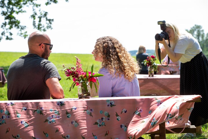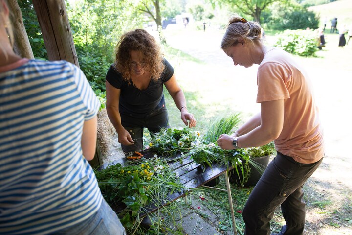 Midt i mængden af interviews og fotoshoots stod tre blomsterbindere og forberedte kranse til dagens scene - sankthans-scenen. Det er den mest omfattende i hele serien, da holdet skal holde styr på både 300 statister og et kæmpebål. (Foto: © Bjarne Bergius Hermansen)7 / 13