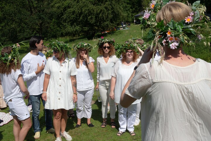 Til tonerne af 'Vi elsker vort land' skulle heksen brændes af. Ved prøverne stod et pigekor med de nylavede blomsterkranse klar, mens produktionsholdet testede lyden. (Foto: © Bjarne Bergius Hermansen)10 / 13