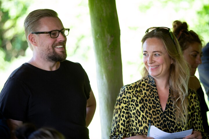 Manuskriptforfatterne trådte frem i den lille pavillon, der fungerede som en oase af skygge midt i den fynske sol. De introducerede skuespillerne og deres roller i dramaserien. (Foto: © Bjarne Bergius Hermansen)4 / 13
