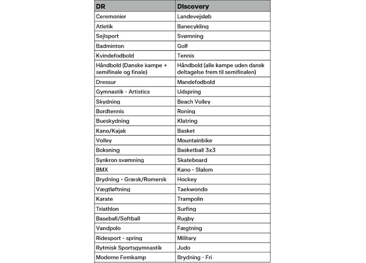 Herunder kan man se, hvilke sportsgrene man kan se på henholdsvis DR’s kanaler og Discoverys kanaler: