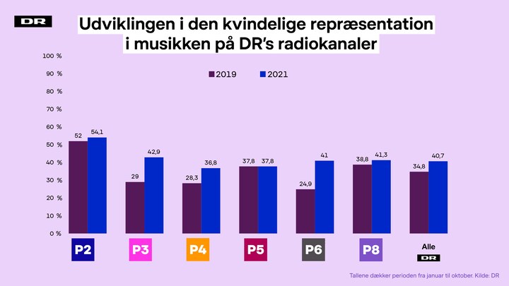 På baggrund af de stribevis af allerede igangsatte initiativer kan DR allerede nu se en mærkbar positiv udvikling i den kvindelige repræsentation på tværs af radiokanalerne - sammenlignet med tal fra 2019. Tallene dækker over de første knap 10 måneder og kan derfor ændre sig en smule frem mod årets slutning.