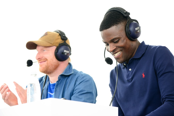 Francis Dickoh (til højre) holdt også fodboldskole, som han gør i podcasten, og både han, og DR's fodoldkommentator Andreas Kraul så frem til det kommende VM i fodbold for herrer i Qatar, ligesom der var masser af anekdoter. (Foto: © Anders Beier)18 / 20