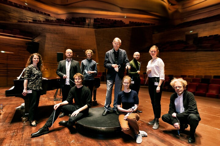 Det er Ole Faurschou (yderst til højre), som er underviser på Malko Dirigentskolen, og i sidste uge havde han tilrettelagt i alt ni timers undervisning - målrettet masterclassen - til de unge dirigentspirer. De er alle startet i Malko Dirigentskolen i denne sæson. Det er tredje hold på skolen, og hvert forløb varer to år. Stående ved siden af Ole Faurschou er Laima Paplauskaite, Hjörtur Eggertsson, Herbert Blomstedt, Adam Koch Christensen, Ludwig Hjortenhammar og Galya Kolarova, der er pianist i dirigentskolen. Siddende: Johanne Sofie Bech Madsen og Benjamin Frimodt Pedersen. (Foto: © Per Morten Abrahamsen, permortenabrahamsen.com)4 / 9