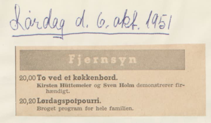 TV-udsendelsen ’To ved et køkkenbord’ eksisterede ikke særligt længe. Seks udsendelser blev det kun til i perioden 1951 til 1953. Derefter forlod Kirsten Hüttemeier DR. Så hvem førte så TV-køkken-traditionen videre? Faktisk ser det ud til, at der ikke var et fast køkkenmagasin i fjernsynet før flere år senere.