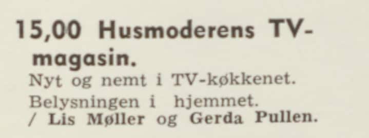 Et nyt tv-format, nemlig ’Husmoderens TV-magasin’ så dagens lys den 4. januar 1961 med Lis Møller og Gerda Pullen som tilrettelæggere, og programmet lå fast en gang om ugen. Magasinet mindede lidt om ’Kvindernes eftermiddagsprogram’, som var blevet sendt i radioen gennem mange år med alle mulige råd til husmoderen.