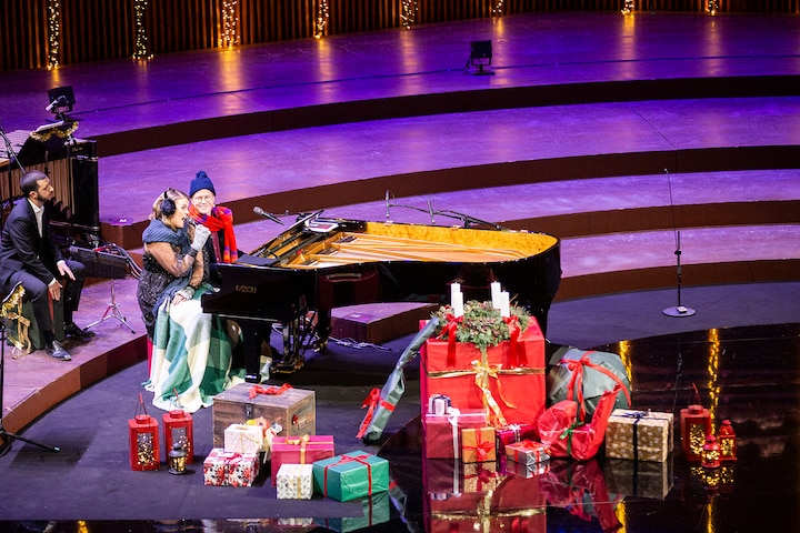 Foran det blanke flygel lå en bunke af indpakkede julegaver i alle størrelser, og til højre for scenen lyste gyldne guirlander og rødlige julekugler op, der pyntede det store juletræ.