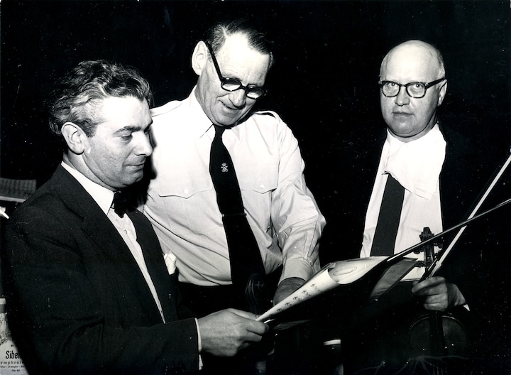 Her ses Kong Frederik IX i marts 1960 sammen med DR Symfoniorkestrets to daværende koncertmestre Charles Senderovitz og Leo Hansen. Helt frem til foråret 1971 - eller tre kvart år før kongens død - var han gæstedirigent. Den dag i dag kan man stadig købe det album, hvor Kong Frederik IX dirigerer DR Symfoniorkestret i værker af Beethoven, Wagner og Gade. Det fysiske album er for længst udsolgt, men det ligger til streaming hos pladeselskabet Dacapo. Kongen indvilgede i 1948 i at lade en række egne indspilninger udkomme hos et pladeselskab på betingelse af, at pladerne skulle bortloddes til fordel for det nystiftede FN’s flygtningeindsamling. Foto: DR Arkiv.3 / 8