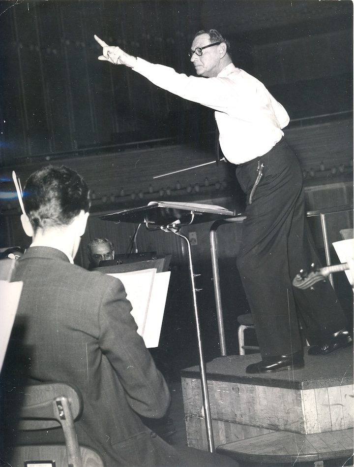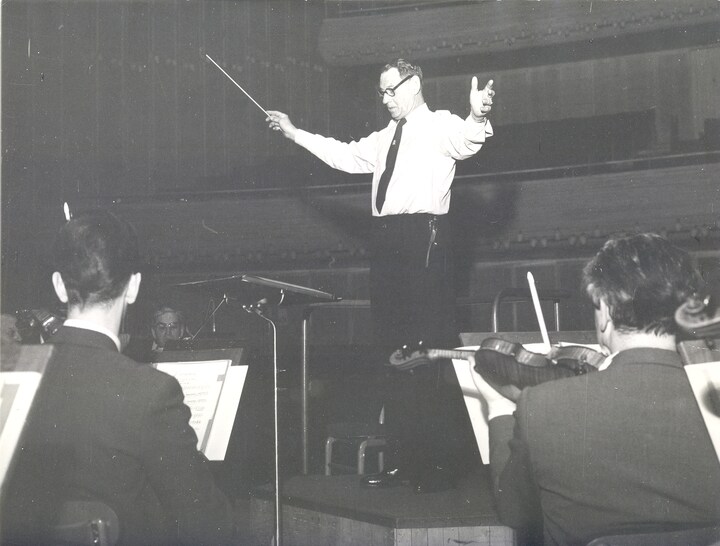 Musik var Kong Frederik IX's helt store passion, og i al fortrolighed blev han fra 1940’erne og frem til sin død i 1972 regelmæssigt inviteret til at dirigere DR Symfoniorkestret. Som regel var der ikke andet publikum end de gæster, Kongen selv måtte have indbudt. Det første samarbejde mellem Kongen og DR Symfoniorkestret fandt sted den 3. maj 1941, hvor Frederik IX dirigerede et af sine favoritværker, Tjajkovskijs 'Pathétique-symfonien'. Båndoptagere og 78-plader løb med, når Kongen dirigerede, så Majestæten kunne få dagens prøvearbejde og opførelser med sig hjem. DR har bevaret kopier af en del af disse lukkede koncerter, og det er nogle af dem, P2 bringer optagelser fra torsdag den 16. april fra klokken 19.20-22.00. Fotoet her er fra 1960. Foto: DR Arkiv.2 / 8