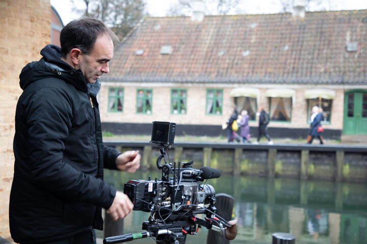 Morten Krüger følger manden med sit kamera. Scenen skal filmes fra flere vinkler, så da skuespilleren har gået sin rute på cirka 20 meter, og Morten Krüger har fået de billeder, han skal bruge, starter de forfra med en anden kameraindstilling.