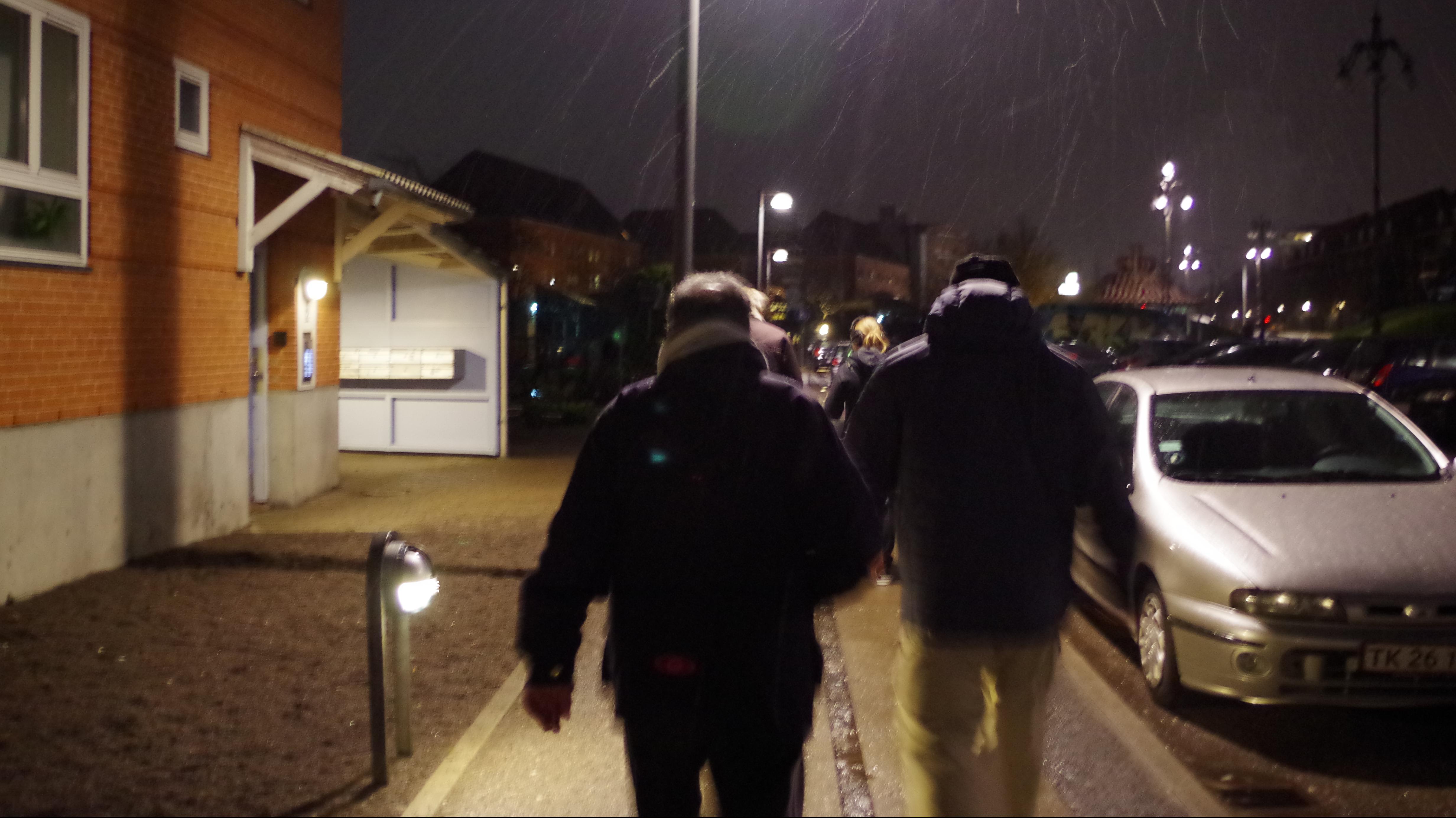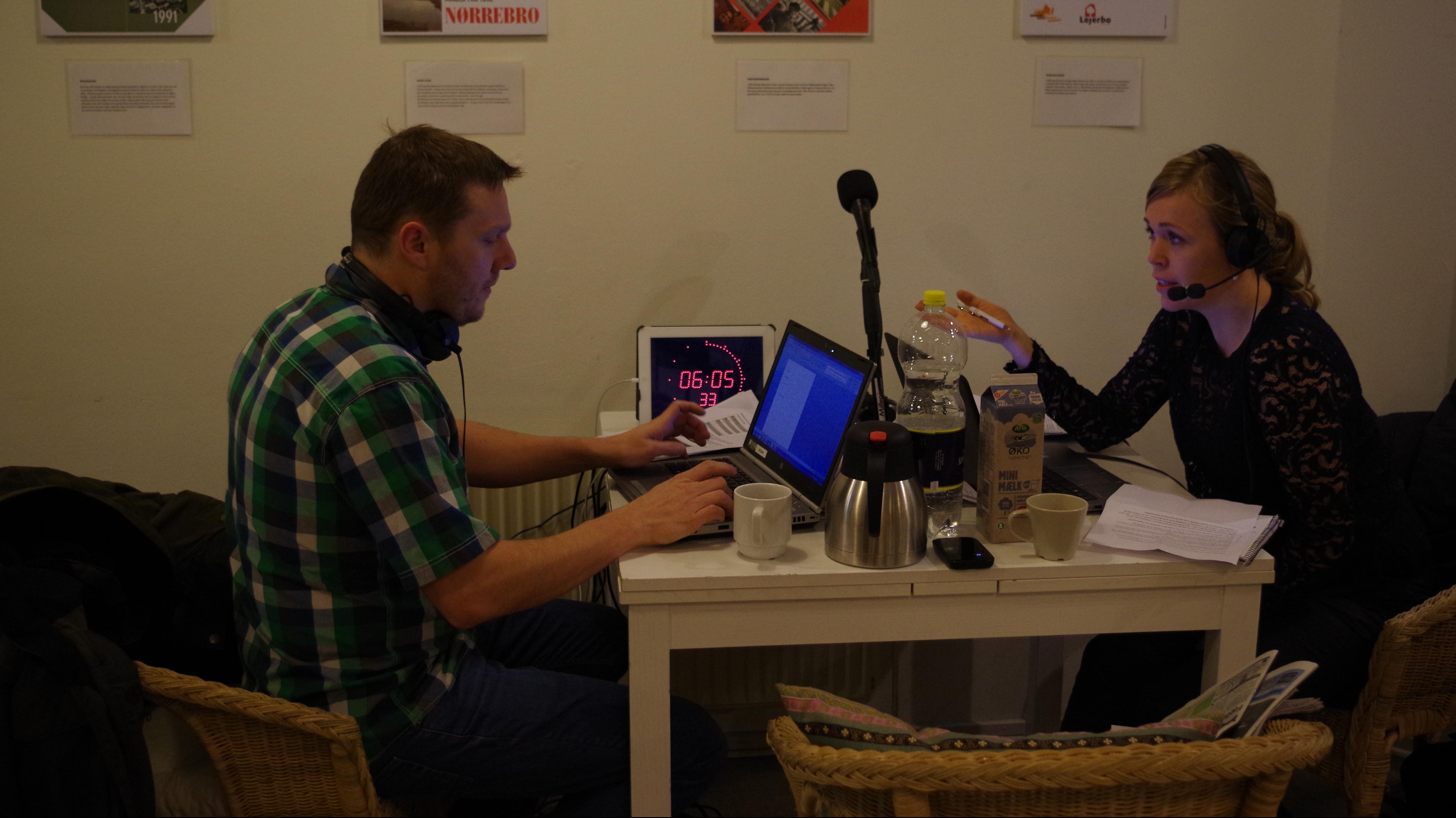 I to kurvestole sidder værterne Maja Rosager og Jacob Pries fra P4 København Morgen. De har sat sig ind i tørvejr på ”Mødestedet” i Mjølnerparken. Udenfor er det slud og kun enkelte har bevæget sig ud i mørket fra de røde murstensblokke.