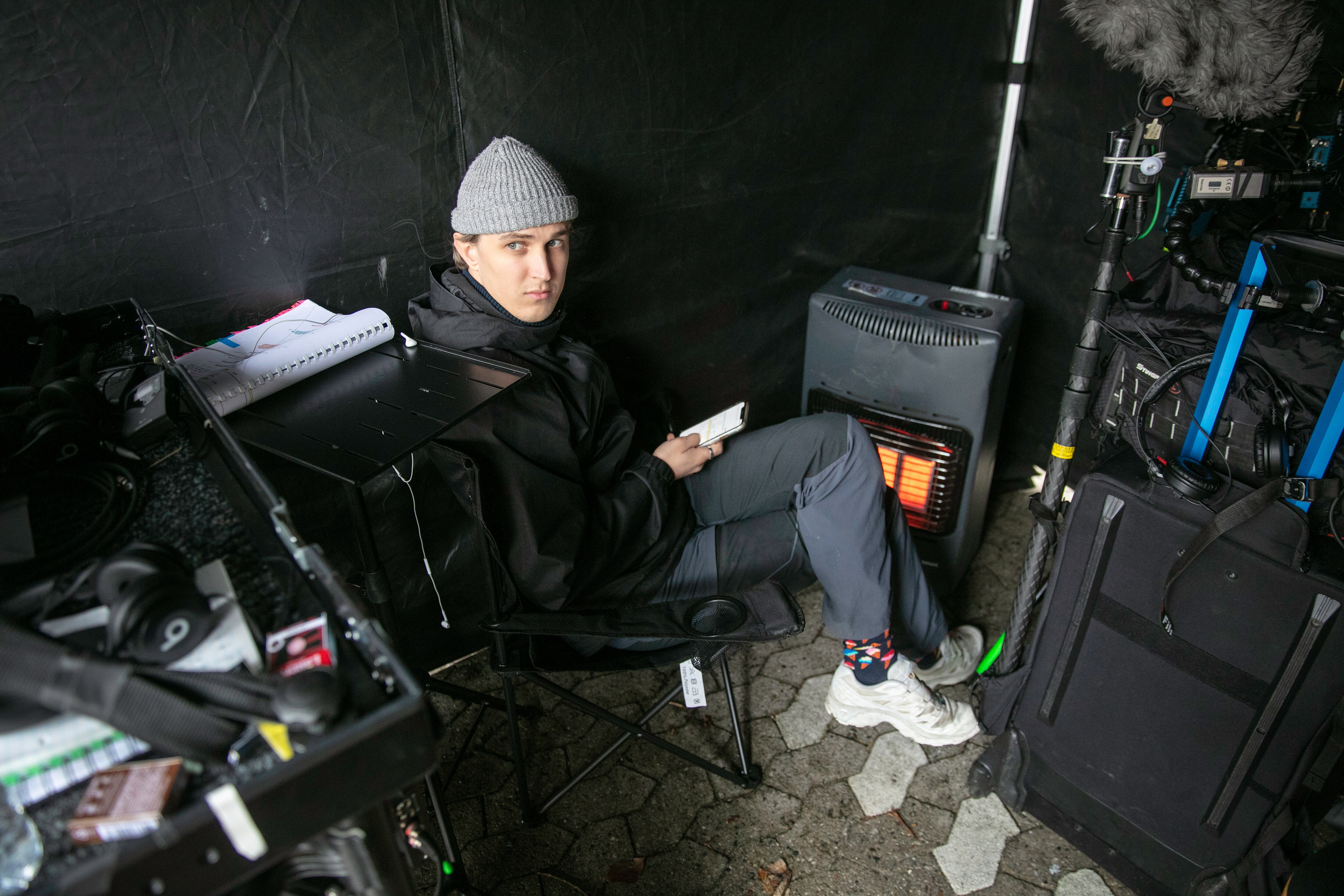 Solen titter stille frem bag de lavtliggende skyer, da de tekniske nøglepersoner møder ind i store last- og varebiler. Spots, tunge kamerakufferter og lydtrolleyer omdanner nu effektivt en parkeringsplads til et film-set. Plastposer, huer og hætter bevæger sig rundt og beskytter både gear, kolde ører og satte krøller.