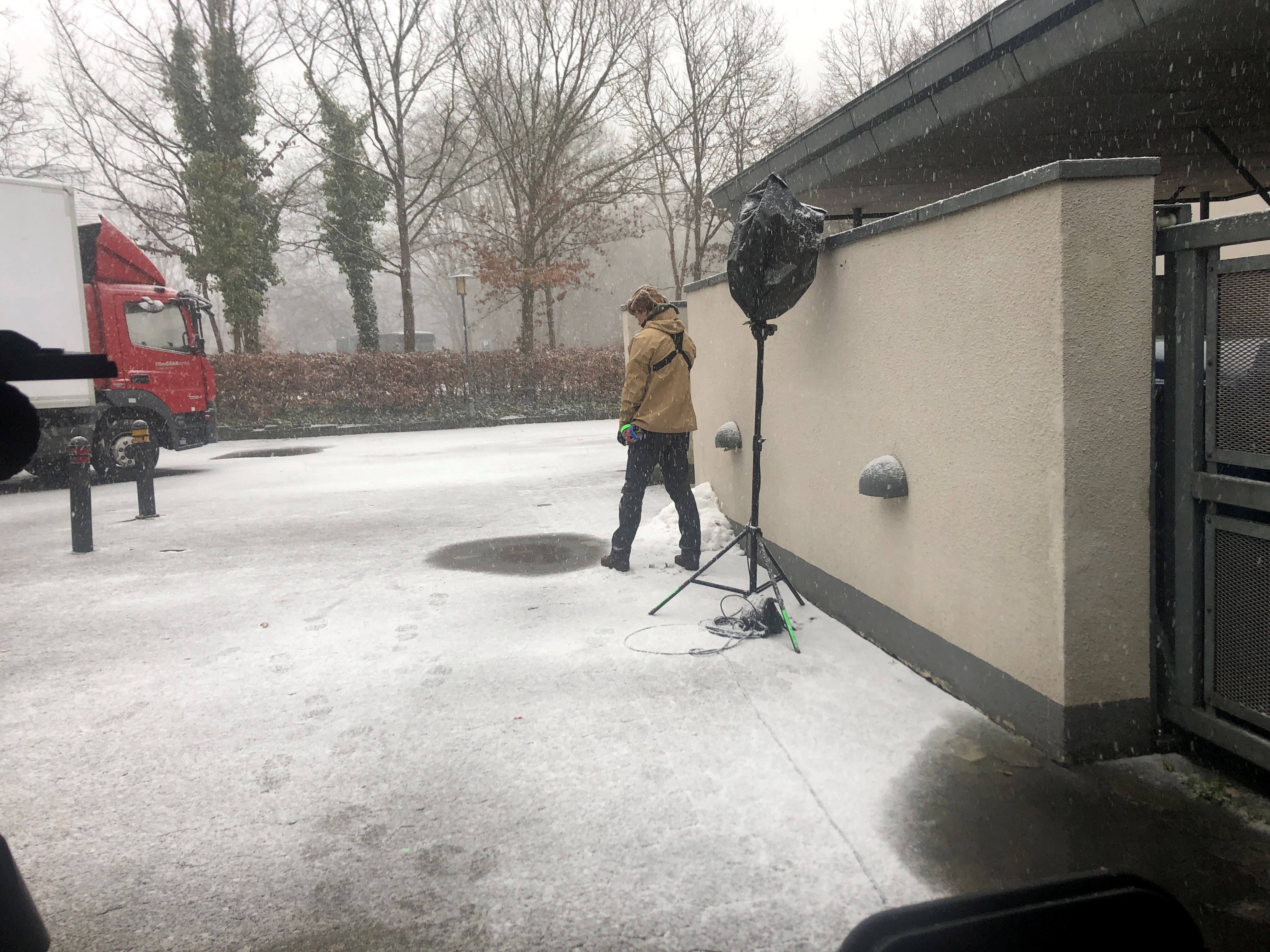 Mørket er begyndt at falde på, imens sneen igen dækker parkeringspladsens afmærkede asfalt. De sidste optagelser på dagsprogrammet skal nu laves indendørs, og det ustadige vejr er ikke længere en trussel. I dag holdt plan A, men i morgen er der igen udendørsscener på programmet - og sne, regn og slud på menuen.