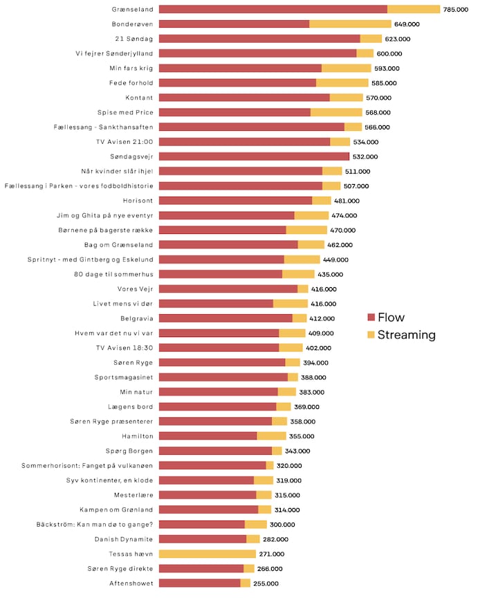 Nu har DR Medieforskning gjort status over seernes forbrug af aktuelle programserier fra DR i juni 2020. I oversigten er tallene for flow-tv og streaming lagt sammen, så man får et mere samlet og retvisende billede af, hvor mange, der tilgår tv-indhold fra DR.