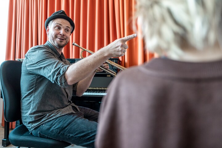 DR Big Bands musikere havde taget deres instrumenter med, så de kunne spille for eleverne til workshoppen. Her er det trompetist Mads La Cour, der spiller og fortæller foran musikskolens blæsergruppe. (Foto: © Christian Larsen, DR Koncerthuset)2 / 7