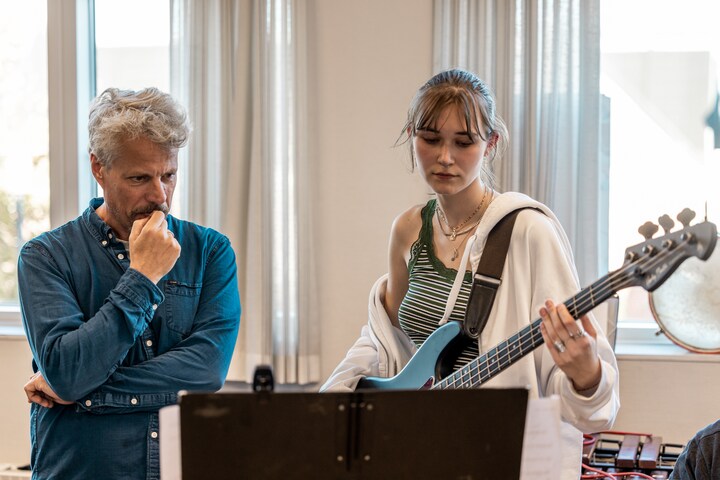 Der blev øvet koncentreret, da musikere fra DR Big Band besøgte Furesø Musikskole mandag den 3. oktober var til workshop med 30 af skolens elever. Her er det bandets bassist Kaspar Vadsholt, der giver gode råd til en af skolens baselever. (Foto: © Christian Larsen, DR Koncerthuset)1 / 7