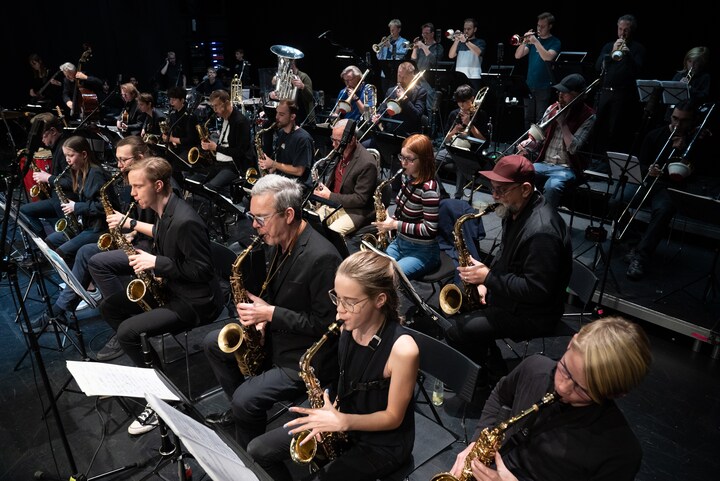 Det er sjovt at øve, men det er endnu sjovere at spille koncert. De 30 elever fra Furesø Musikskole var med på scenen til DR Big Bands koncert i Galaksen i Værløse, hvor de spillede med på fire af koncertens numre. I midten af billedet ses bandets saxofonist Peter Fuglsang og skråt bag ham Hans Ulrik. (Foto: © Nicolas Koch Futtrup © DR)3 / 7
