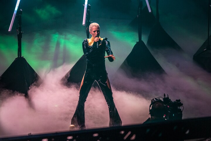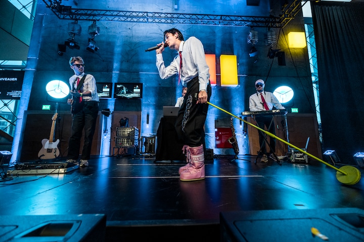 Og her er det USSEL - den anden karrierekanon-vinder, der er trukket i moonboots og giver den gas. (Foto: © Christian Larsen, DR Koncerthuset)6 / 19- Normalt er der rød løber til premierer og store koncerter, men ved P3 Guld var der selvfølgelig 'gylden løber'. Her er det en række af P3's medarbejdere og værter, der har gjort deres entré på den. (Foto: © Agnete Schlichtkrull)7 / 19