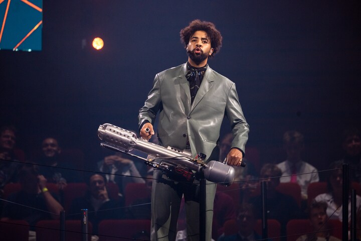 Vært Andrew Moyo sørgede bogstaveligt talt for, at kanonen blev fyret af i aftenens løb fra scenen. Ud af den kom der ikke mindst P3-merchandise til de mange fans af kanalen i Koncertsalen. (Foto: © Christian Larsen, DR Koncerthuset)10 / 19