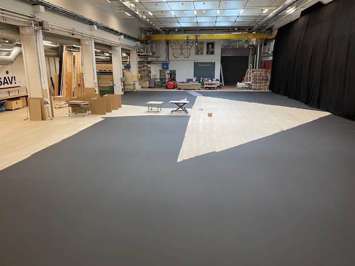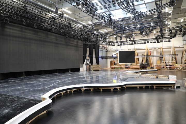 Arbejdet blev indledt mandag den 10. oktober, og først blev der sat spånplader op på det 700 kvadratmeter store gulv. Siden er der blevet sat lamper og skærme op, kraner til kameraer og alt det lydtekniske med mere. (Foto: © Sofie Bøje Gerdes)4 / 7