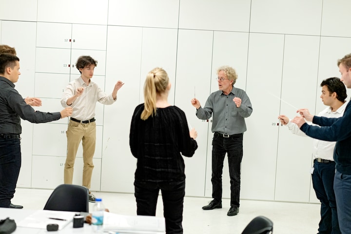 Når en dirigent skal øve sig, foregår det ofte uden orkester. Her får de seks Malko-studerende undervisning i direktionsteknik af dirigenten Ole Faurschou. De øvrige discipliner på dirigentakademiet omfatter klaverspil, hørelære og musikteori. (Foto: © Agnete Schlichtkrull)6 / 7